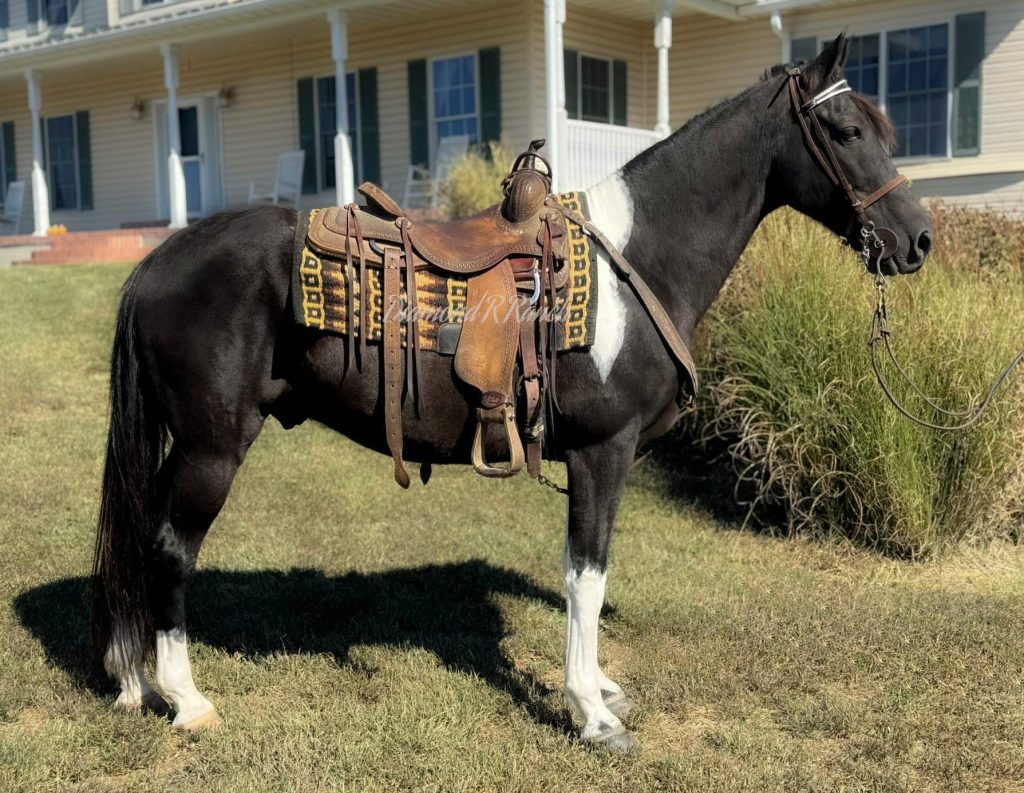 “Cisco” is absolutely beautiful! He is marked up with the perfect amount of white and his mane hangs nearly to the bottom of his shoulder. He is a 9 year old grade Missouri Fox Trotter gelding. He is 15.2 hands tall. He is a seasoned trail riding horse. He has been ridden in the hills and rocks and can handle anything that you point him at. He is very quiet. He will ride out alone if you don’t have anyone to ride with. He will walk with Quarter horses. He has a wonderful smooth natural gait. He will canter right out of his tracks. He will ride one handed or two. Just whichever you prefer. He will cross water. Mud doesn’t bother him. He stands quietly for grooming, bathing and putting your saddle on. He loads and hauls well. He is good in the stall and gets along well with other horses in the pasture. This handsome guy will turn heads everywhere you ride him. If you are looking for a smooth and flashy trail horse, then you will love Cisco!