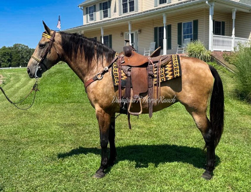 “Caroline” is a stunning buckskin grade Missouri Fox Trotter mare. She is 15.2 and stout built. This beautiful mare has a wonderful disposition. She is 10 years old. She was raised, trained and ridden by a gentleman in his 80’s. He finally had to make the hard decision to give up riding. Caroline is too special to just stand in the pasture without someone enjoying her. She has been to lots of big trail rides. She has camped and will stand tied on the picket line. She is a wonderful trail riding horse. She will walk along slowly with Quarter horses. She has a wonderful smooth gait that you can ride for hours at a time without tiring. She will lead the ride if you want to but she will also bring up the rear. She rides just fine out alone. She will ease over slick flat rocks, ease over downed trees and ride through the brush if you like to trail blaze. She can go for long periods of time without being ridden and she will stay GENTLE. She will ride bareback with just a halter if you don’t want to put your tack on. She loves people and she loves to be brushed. She is good for the farrier, a haircut and a bath. She loads and hauls well. She will even load herself if you open the door. She is so much fun. You won’t find a more enjoyable horse to ride. This beautiful girl has always had the very best of care and we will only sell her to someone that will take incredible care of her. If you are looking for a gorgeous buckskin with an incredible gait and a wonderful disposition to go with it then you will love Caroline!!