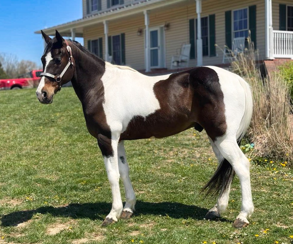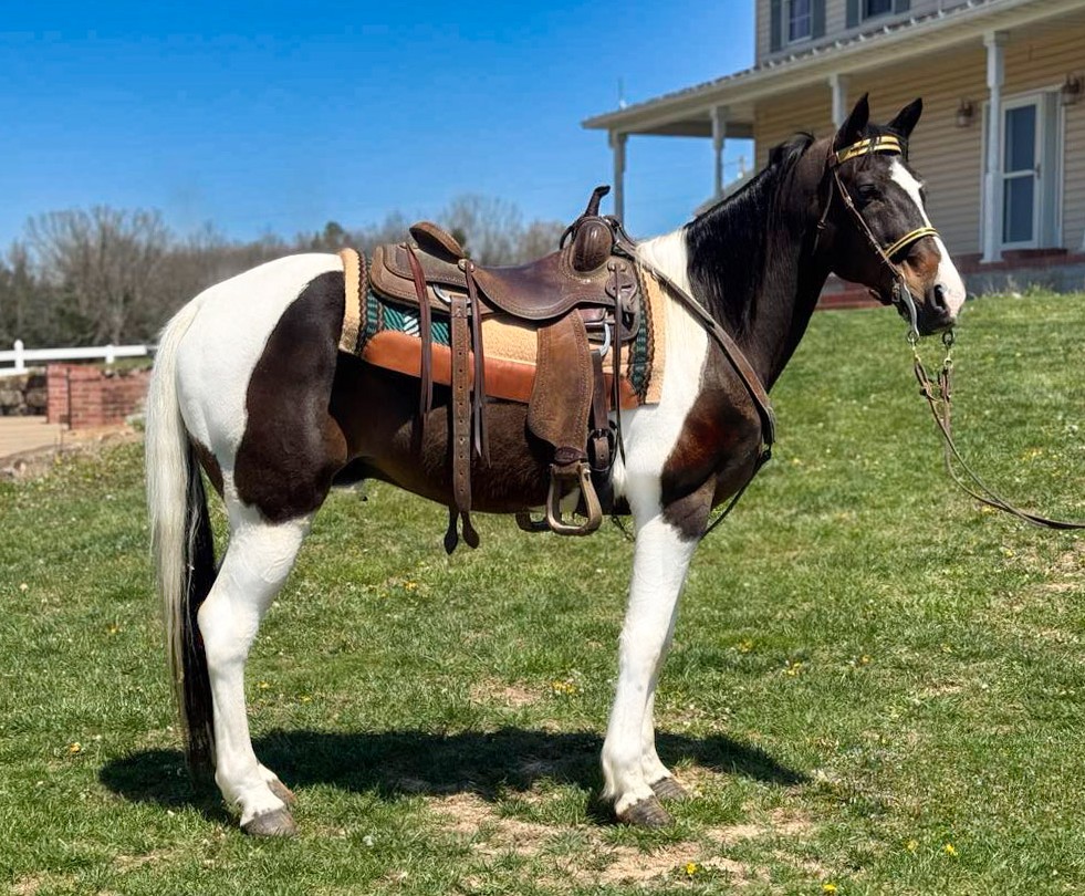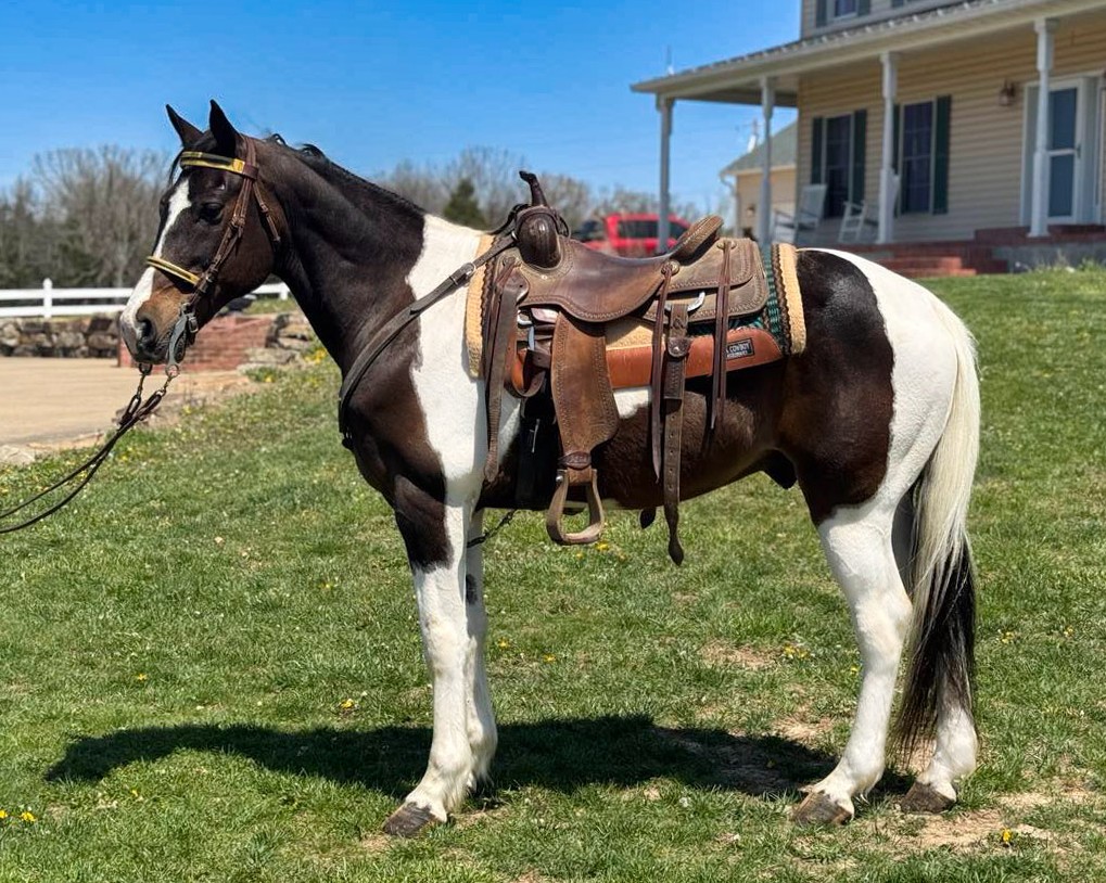 “Tango” is a beautiful tri-color spotted grade Missouri Fox Trotter gelding. He is 12 years old and 15.1 hands tall. If you are looking for a smooth gaited horse then you have found him!! He is very gentle and an amazing trail riding horse. He will ease down those steep rocky hills being sure to get his rider safely to the bottom. He crosses water and the doesn’t mind to get his feet muddy. You point him and he goes there. He will walk along easy if you ride with Quarter horses. He has an incredibly smooth trail gait. He has some speed if you want to move out a little faster. He is traffic safe if you ride on the road. He is good with the farrier. He gets along well with other horses. He is a sweet boy and he is looking for a new trail riding buddy.